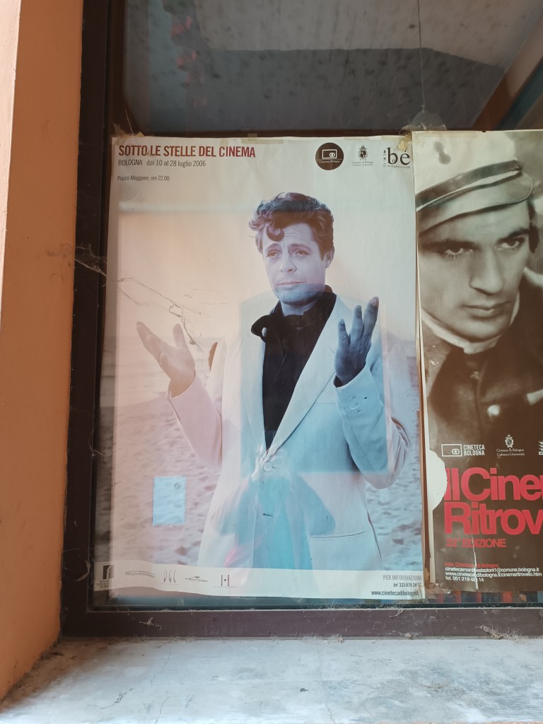 La routine commence à s'installer à l'auberge. Je me lève vers les 7h15 pour préparer le petit-déjeuner, puis je fais les lits et ensuite j'accueille quelques voyageurs. Il fait beau, je décide d'aller me promener du côté de la Cinémathèque. Pas de chance, elle est fermée. Enfin, pas vraiment mais visiblement il n'y a que des bureaux et une salle de projection. La boutique se trouve Piazza Maggiore. En tout cas, je vois une affiche avec Marcello Mastroianni et ça me fait plaisir.