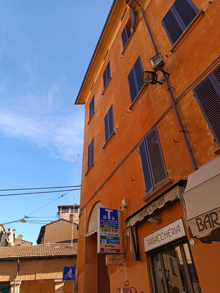 Peut-être est-ce en raison de la teinte légérement orangée de mes lunettes de soleil mais, avec ce soleil, tout me paraît incroyablement beau. Je passe par une petite place qui s'appelle la Piazzetta della pioggia, mon endroit préféré n°2 à Bologne. Le 1er étant la Piazza Santo Stefano. Regardez-moi cette petite placette, son église, ses murs ocres, les enseignes en italien... Je m'y sens bien, sans trop savoir pourquoi.