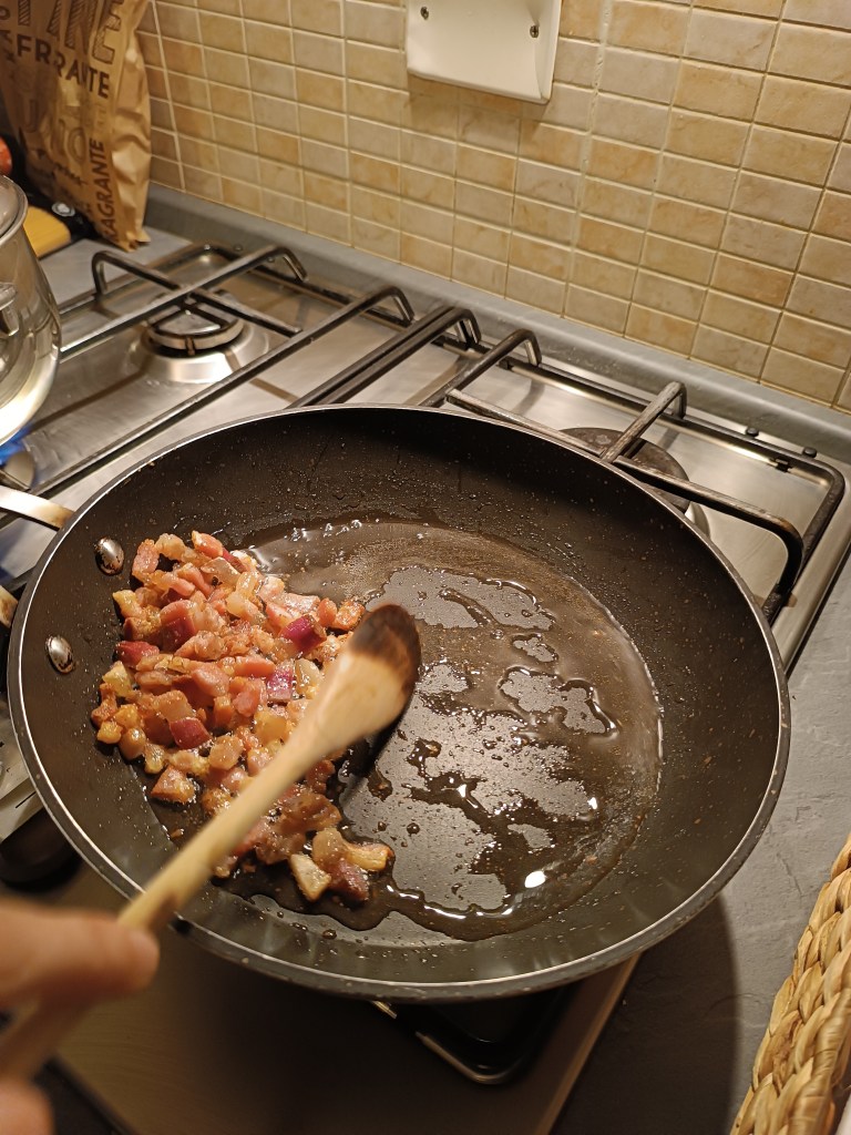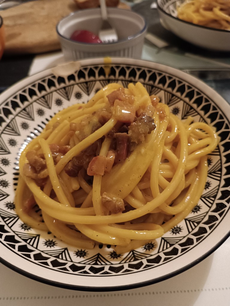 Le temps semble s'être arrêté dans les années 60 au bar Volare et pourtant, l'heure continue bien de tourner et je dois m'activer pour retrouver Teresa chez elle, dans le quartier de Bolognina (au nord de Bologne). Elle m'a accueillie les bras ouverts, et je lui en suis très très reconnaissante. En plus, elle a tout acheté pour faire une carbonara ! Mamma mia je vais m'évanouir. Nous discutons de tout et de rien, elle me partage ses astuces pour une carbonara réussie, elle me montre des photos du bar-restaurant de ses parents en Calabre et nous mangeons tranquillement. Buona la carbonara !! Brava Teresa !