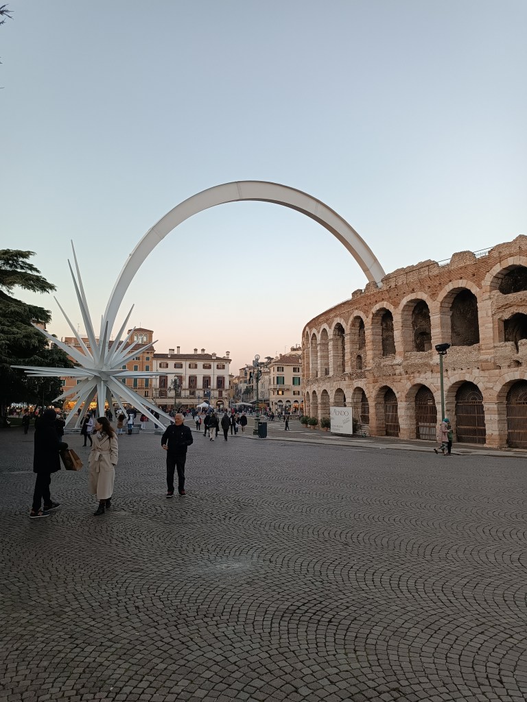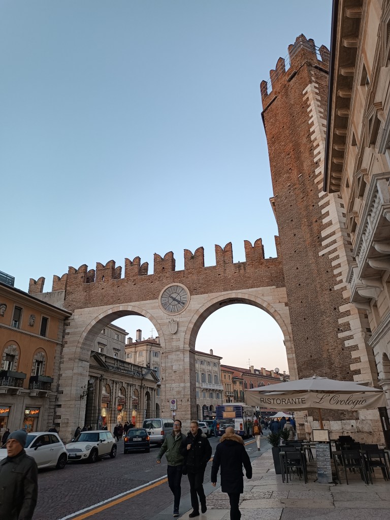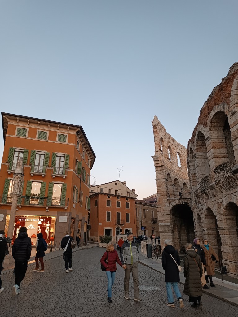 Je me dépêche de déposer mes affaires à l'hôtel pour profiter des dernières heures du jour. Oh, je vois des montagnes au loin ! La lumière est douce, le ciel légérement rosé. Ca y'est, j'entrevois les portes de la citadelle. A moi Vérone ! J'ai bien fait de m'arrêter dans cette ville. Dès les premiers instants, j'ai été conquise. Le soleil a certainement contribué à ce que je m'émerveille à chaque coin de rue, encore que, c'est surtout de nuit que j'ai découvert la belle Vérone. Premier repère : les arènes. Je les aperçois, majestueuses, sur une place bordée de maisons colorées.