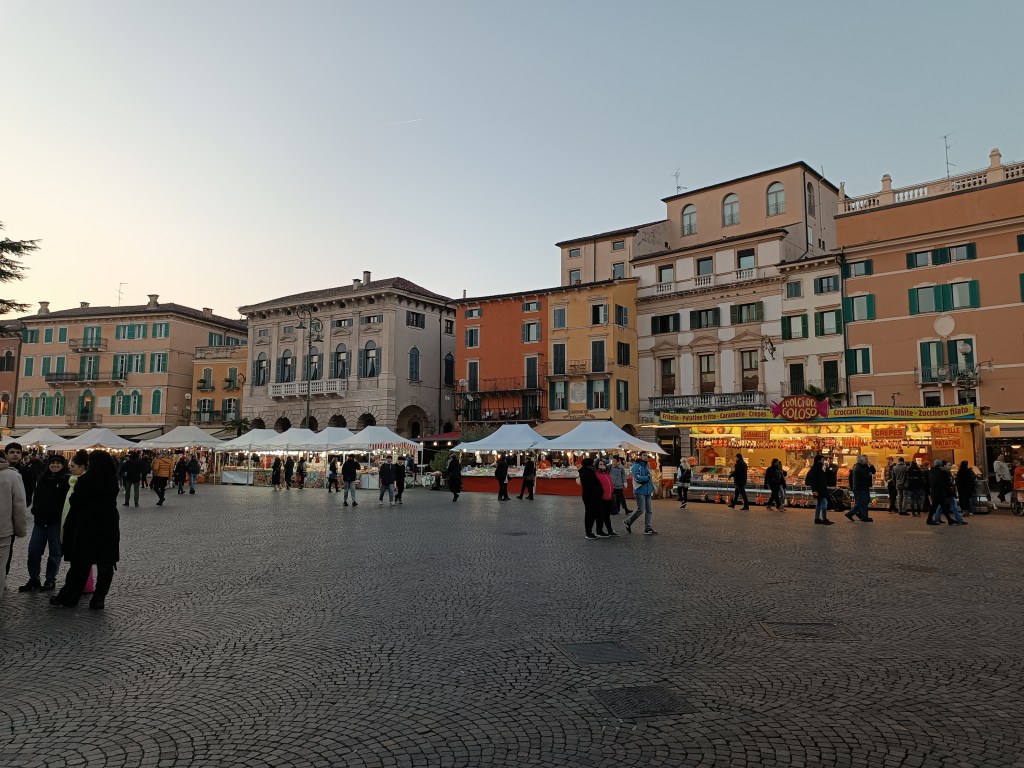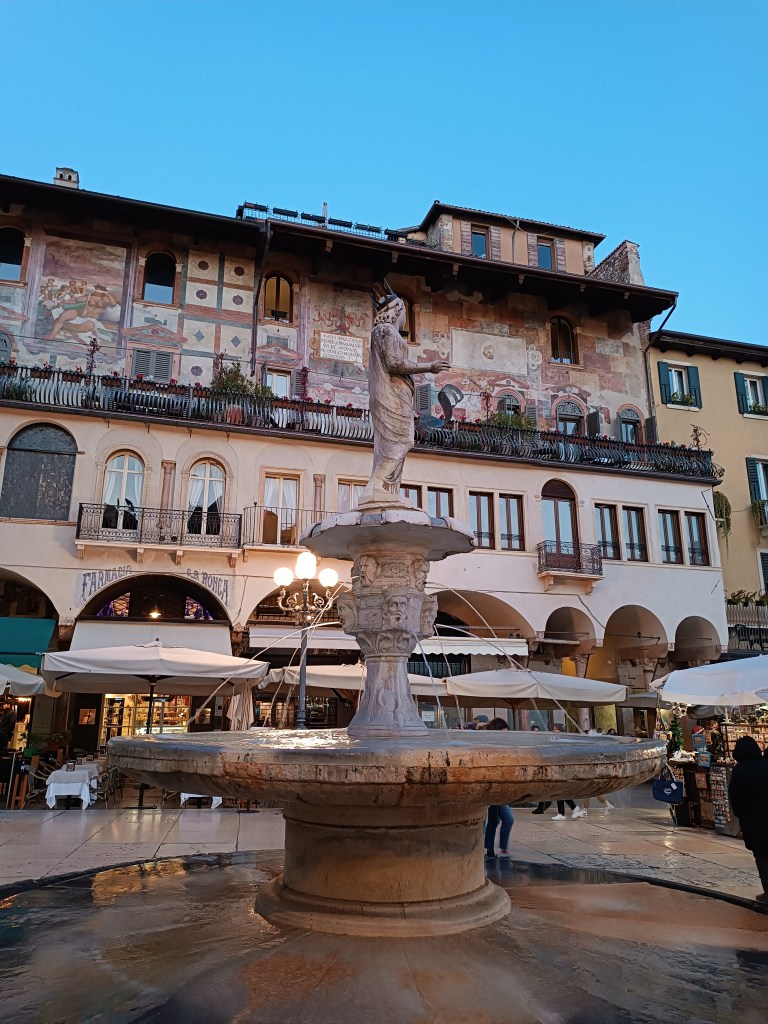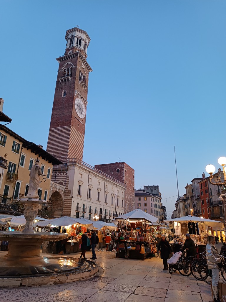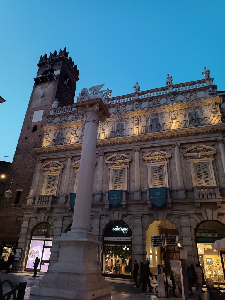 J'arrive à la Piazza delle Erbe, l'ancien forum romain. Tiens, le lion de Saint Marc veille du haut d'une colonne ! Une maison est recouverte de fresques du 16e siècle. Derrière elle, se dresse la Torre dei Lamberti. Elle ne penche pas celle-là. Au fond de la place, le Palazzo Maffei construit au 15e siècle. La place est un peu biscornue, les styles architecturaux se mélangent. J'aime. Je ne fais que regarder en l'air, et malgre le froid, je continue mon tour avec enthousiasme.