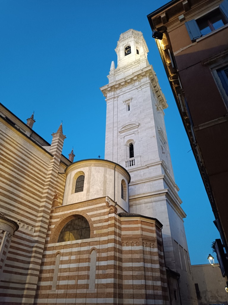 La nuit arrive à grands pas, je vois la pleine lune au loin, imposante et mystérieuse. Oh la la Vérone, tu sors le grand jeu ! Je visite la cathédrale, un papa et son fils joue au foot sur le parvis. C'est plus calme par ici, je peux lancer à voix haute des "oh mais comme c'est beau" "oh non mais c'est vraiment trop beau" sans que l'on me jette des regards inquiets.