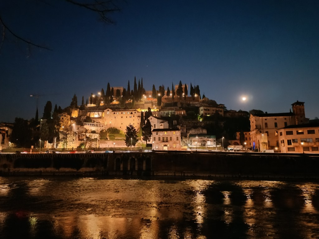 Cette ville a vraiment un charme particulier. J'aimerais la découvrir au printemps (ouais parce que bon ça va deux secondes les gants et le bonnet hein) et prendre un café ou un cocktail dans tous les cafés de la via Sottoriva. J'arrive au Ponte Pietra et admire enfin le fleuve Adige. En face, sur une collinette, le teatro romano et le Castel San Pietro. Des cyprès et des pins parasol se détachent en ombres chinoises sur fond de ciel bleu nuit. Et la lune à droite. Et ben c'est beau les amis.