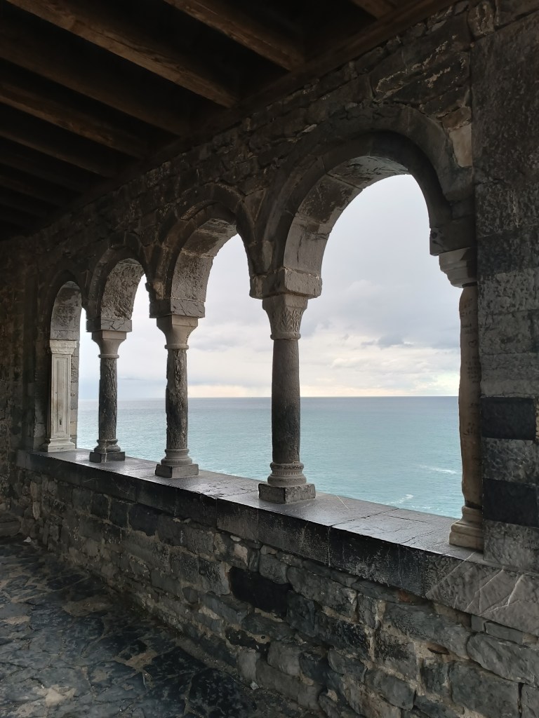 Dans la famille des Cinque Terre je voudrais... Portovenere ! Et oui, en plus de Monterosso al Mare (d'ailleurs c'est drôle ça fait Montrouge-sur-mer en français, me signale Simon), Vernazza, Corniglia, Manarola et Riomaggiore, un sixième joli petit village coloré au bord de la mer se cache sur cette côte ligurienne décidement pleine de surprises. Portovenere (ou Porto Venere) n'est qu'à une dizaine de km de La Spezia. Nous l'avons rejoint en bus de bon matin. Enfin... Après avoir englouti un croissant à la pistache et un cappucino bien sûr. Porto Venere se trouve dans un parco naturale et nous avons longuement hésité entre la marche et le bus... Finalement, nous avons opté pour la seconde alternative car nos mollets étaient un peu fatigués de la veille. De plus, le temps était assez incertain. Après une trentaine de minutes dans le bus donc, nous arrivons au port de Porto Venere. C'est mignon, c'est tranquille (comme partout en décembre à vrai dire...). C'est aussi plus historique. Il y a en effet un petit centre médiéval qui se termine par une belle esplanade avec une église en pierres d'où l'on peut observer le golfe des poètes. Nous achetons quelques clémentines au marché puis nous commençons notre tour.