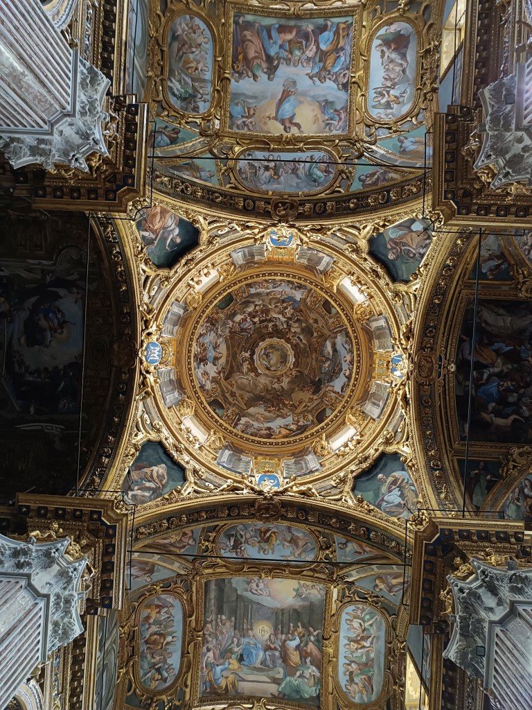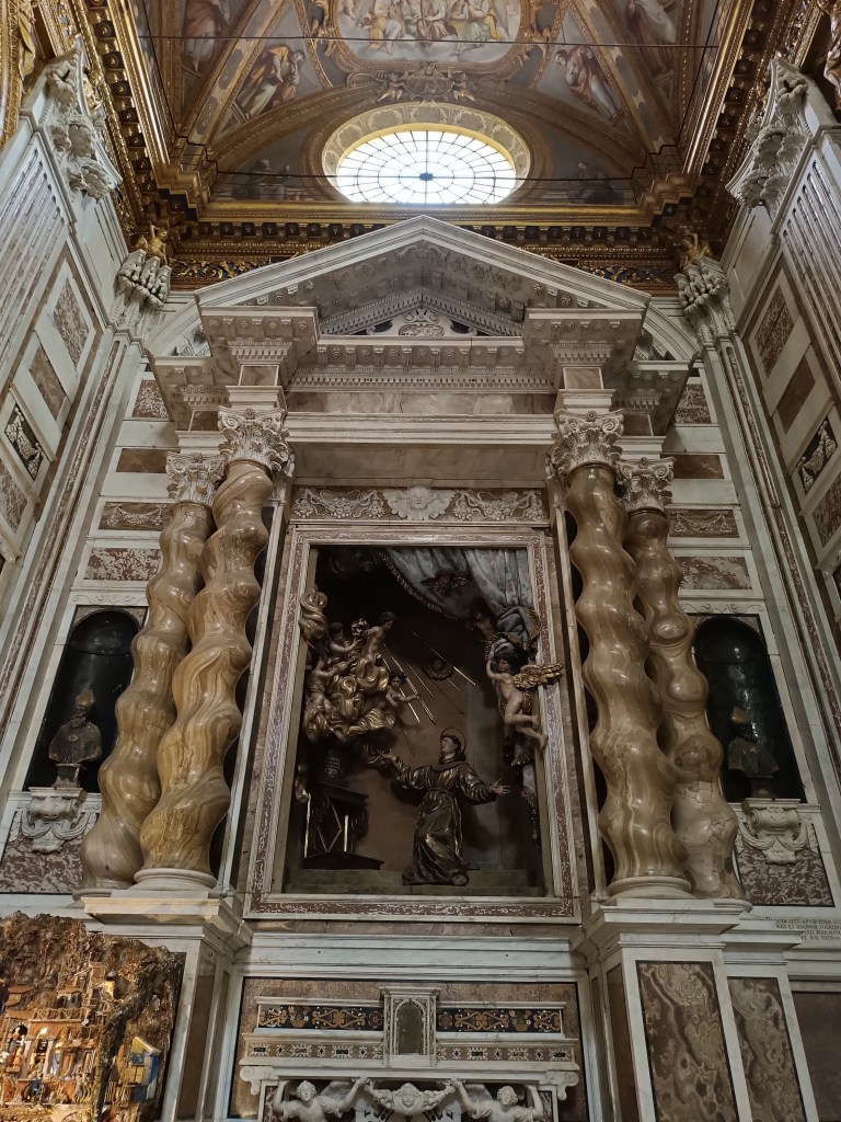 Sur notre route, nous croisons la basilique Santissima Annunziata del Vastato Un bijou ! Rythmée par des colonnes en marbre rose et blanc de Carrare, cette cathédrale abrite notamment des sculptures en bois remarquables, entourés de colonnes salomoniques. Un tableau en 3D en quelque sorte !