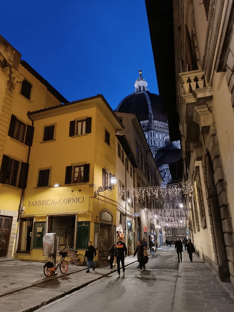 Il fait doux ici ! C'est pas la Sicile, mais c'est pas le Piémont non plus (genre j'intègre la géographie italienne dans mes expressions maintenant, comment j'me la pète pouet pouet). L'endroit où je loge se trouve à environ 20 minutes de la gare. Je m'y rends à vive allure, avec un peu d'appréhension et en même temps l'envie de savoir à quelle sauce je vais être mangée pour ce nouveau volontariat. Cette fois-ci, je suis dans un bed and breakfast et j'ai une chambre rien qu'à moi. J'essaye d'humer la ville mais avec la valise et la fatigue du voyage, je n'arrive pas vraiment à admirer quoi que ce soit. Et voilà qu'à l'angle d'une rue, je le vois. Le dôme ! Un bon gros pèpère qui me servira de repère tout au long de mes escapades florentines.