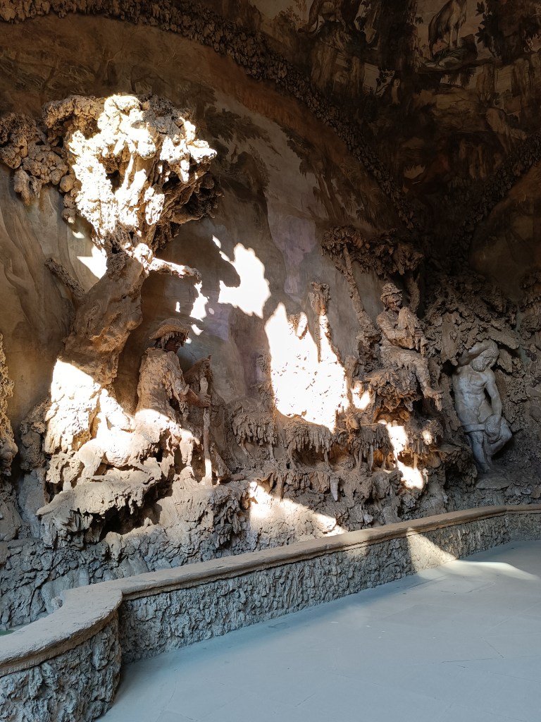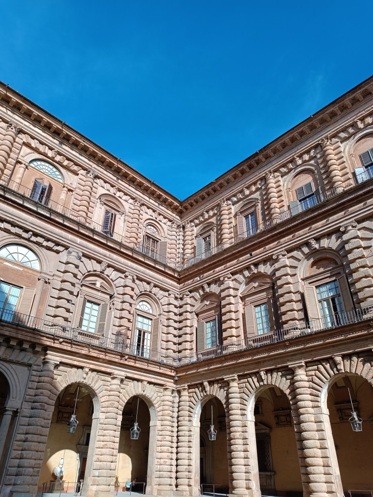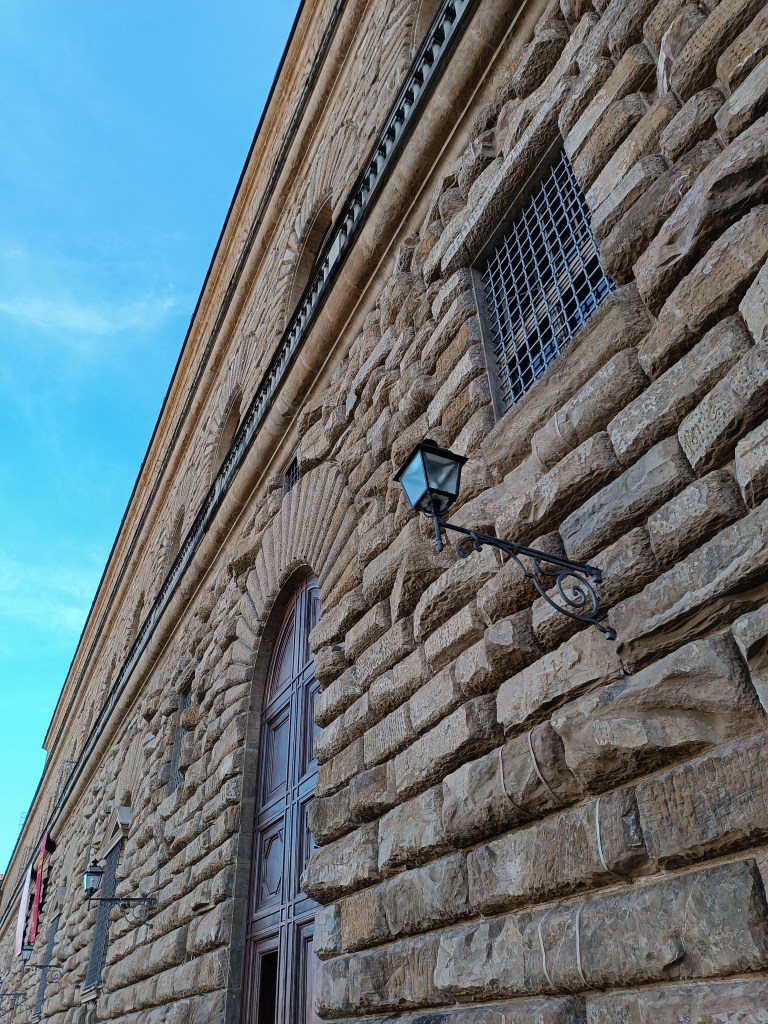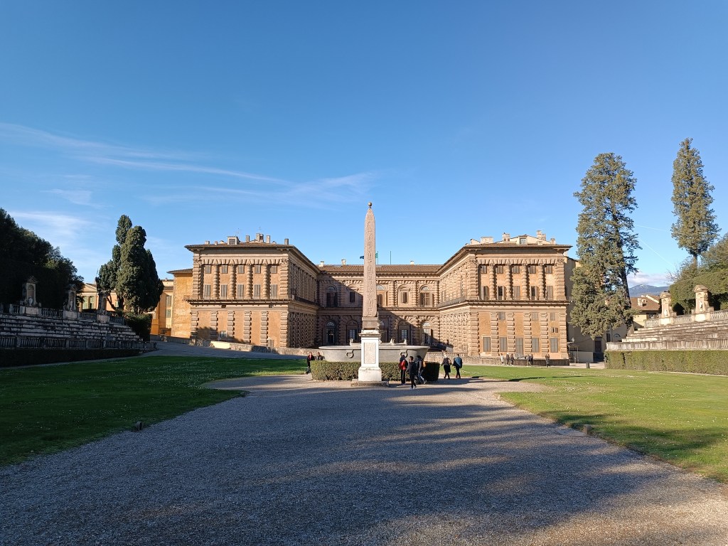J'arrive sur l'esplanade du Palazzo Pitti. Il impressionne ce palais ! Je reconnais quelques éléments architecturaux qui ont influencé le Palais du Luxembourg, voulu par une certaine Médicis, à Paris. L'entrée du jardin attise la curiosité avec cette porte monumentale et cette écriture dorée. L'entrée d'un autre monde.