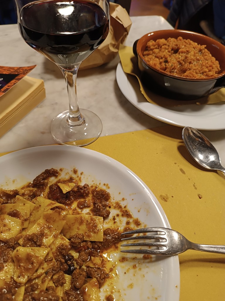 Quel lieu magnifique. Je redescends tranquillement vers le quartier de San Niccolò. Je radote, mais... J'adore ce quartier. Je tombe sur la maison de Galilée puis je m'installe ,juste avant la fermeture des cuisines, dans une trattoria que je voulais tester depuis un petit moment. J'AI FAIM. Je commande une pappa al pomodoro et des pappardelle al cinghiale. Et un verre de vin.