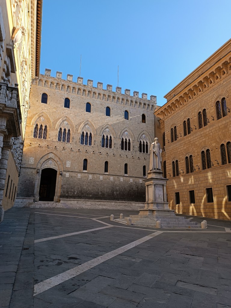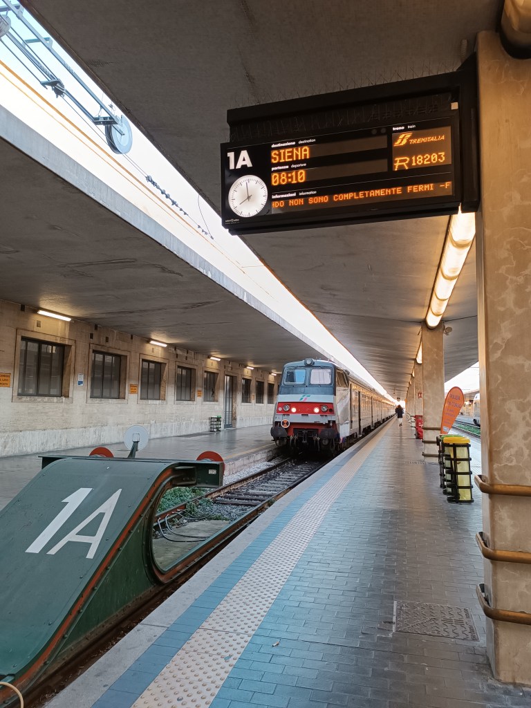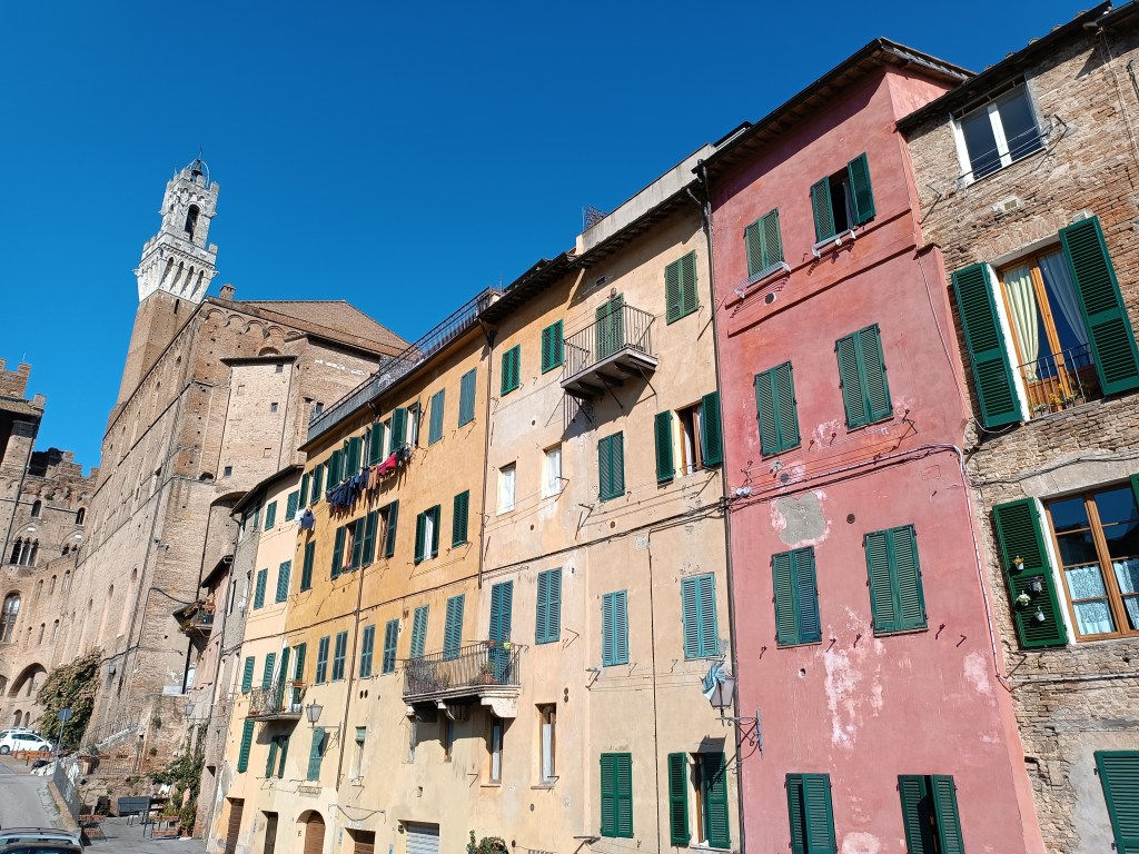 Je me rends donc enfin à la gare de Florence pour prendre le train pour Sienne. J’ai pris un train assez tôt mais je n’ai pas trop peiner à me lever en pensant à la journée qui m’attendait. Sienne m’a toujours intriguée. Une ville couleur terre, une ville sans eau, au milieu d’une campagne pittoresque. La gare est un peu excentrée, et pour accéder au centre-ville il faut passer par un centre commercial. Bon ok. J’arrive enfin à la Porta Camollia, l’une des entrées du centre historique. Il est encore tôt, ça s’active pour ouvrir les commerces. Je continue de descendre la Via Camollia.