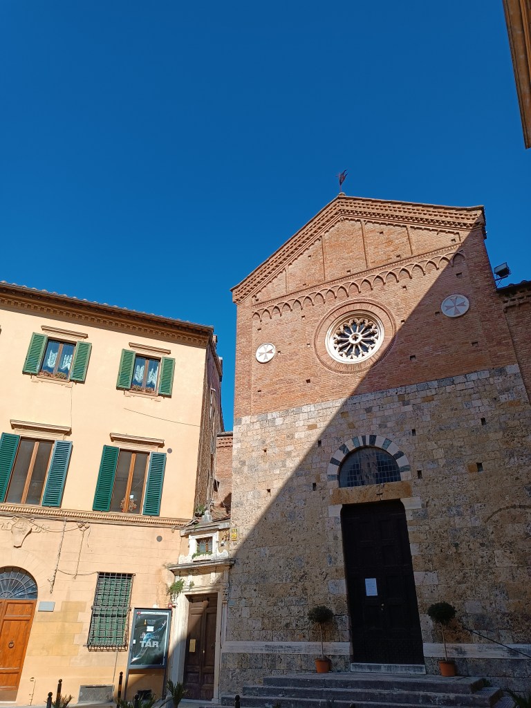 Dai, su ! J’ai encore un panino à acheter, une fontaine qui parle et une piazza à voir avant de prendre le bus. Je prends un panino dans une épicerie (Gino Cacino). Un peu sombre à l’intérieur mais ça foisonne de bouffe. Je prends un panino avec de la scamorza, des oignons caramélisés et des tomates séchées. Je le mangerai dans le bus. Je découvre la belle Fonte Branda, l’une des fontaines les plus belles de Sienne. Son eau limpide me donnerait presque envie de me baigner. Je remonte la via San Caterina, magnifique. Je me rends ensuite Piazza dell’Abbadia, une charmante petite place comme je les aime. L’Eglise est bien sûr, fermée.