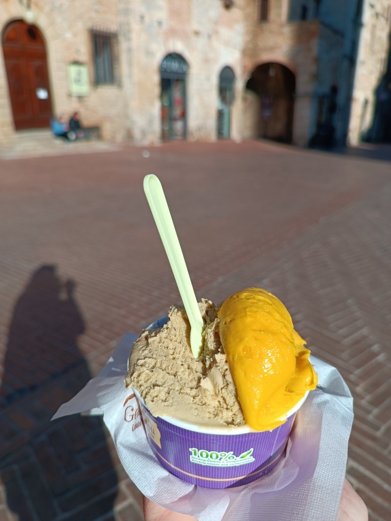 Je continue l’exploration de cette cité parsemée de « belle torri » et j’attrape une glace au passage. Je la déguste Piazza della Cisterna (il y a un puits au centre), bordée de remarquables palais médiévaux.