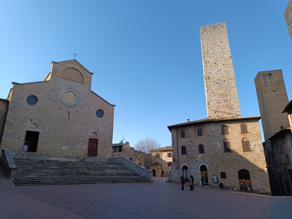 J'ai faim. Et je commence à me dire que je pourrais aller à San Gimignano puisque tout est fermé ici… Ca s’active dans mon cervelet, je vois que je peux prendre un bus, il y en a un qui part à 13h50, ça peut le faire… Allez, je me dirige en direction de la place du marché. J’adore. C’est calme, il fait presque chaud… Je sais que je suis sur le point de manger alors tout va bien. J’observe la vue sur les quartiers sud de la ville. Il y a un motard qui a mis les Beatles sur son enceinte. Ca passe crème.