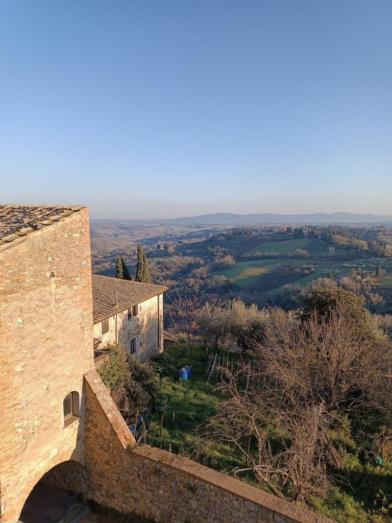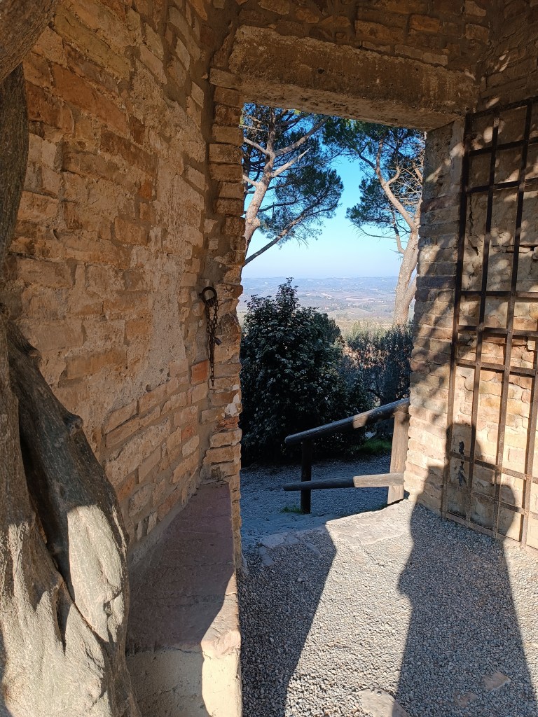 Je grimpe vers un autre point de vue. Depuis l’ancienne muraille, j’observe un autre morceau de campagne toscane. J’y reste au moins une heure.