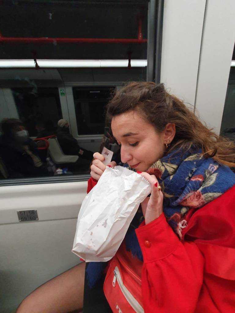 Nous trouvons un chouette restaurant juste en face de l'entrée de la cité et reprenons des forces avant de retourner à Naples. Sophie a envie de manger des chiacchiere, les spécialités du carnaval. Nous nous arrêtons dans une boulangerie et elle les déguste dans le train. Je les zyeute mais laisse le soin à Sophie de leur faire leur fête.