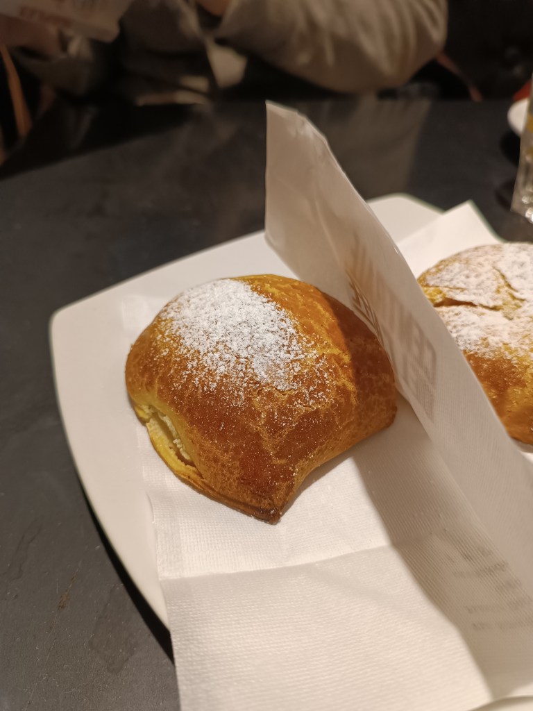 Arrivée à Naples, je retourne à notre hébergement et nous faisons le goûter avec Sophie. Nous goûtons les fiocchi di neve, une autre spécialité beaucoup plus récente que la sfogliatella. Elle a été inventée par la pasticceria Poppella. C'est une sorte de beignet rempli à la crème de ricotta, on adhère !