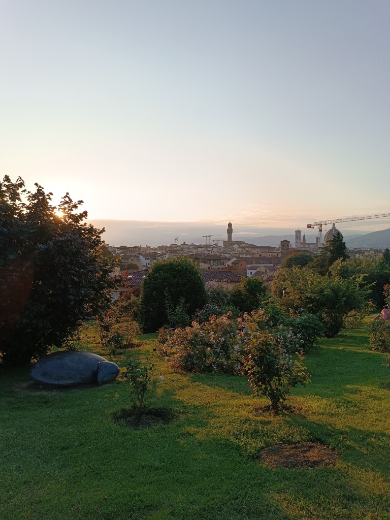 En attendant un retour d'un potentiel job, j'ai en effet décidé de me lever sur mes petites pattes, de me bouger le c... Euh pardon c'est un sketch de Les Nuls ça. Je reprends. J'ai en effet décidé de rejoindre une association qui s'occupe des espaces verts à Florence. Elle s'appelle Gli Angeli del Bello. Je l'avais repérée sur l'Internet et puis je les ai vues en vrai, les petits bonhommes orange, s'activer dans le Jardin des Roses. J'ai pris ça comme un signe du destin. En parlant de ce jardin, voici une photo prise au coucher du soleil.